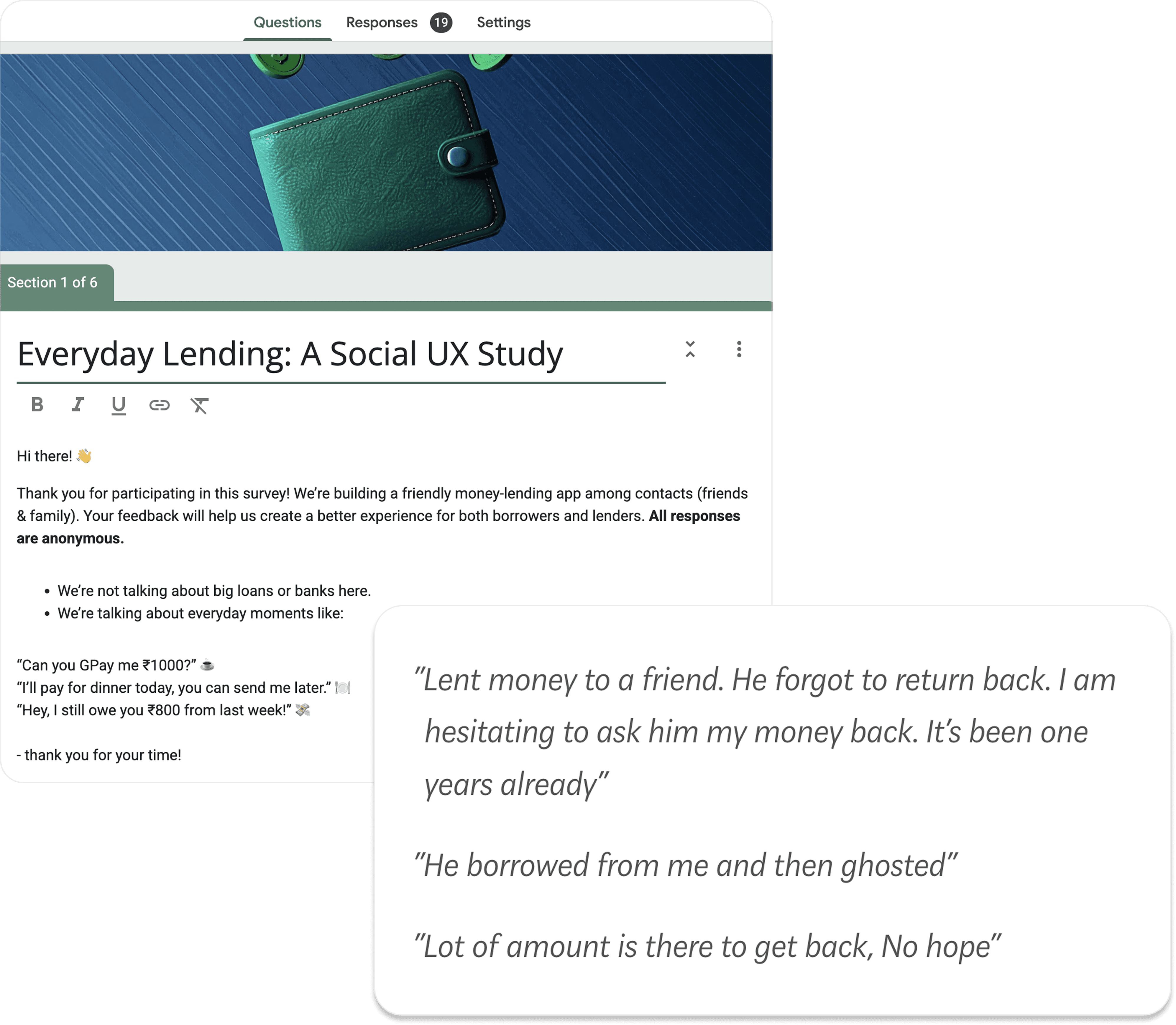 I gathered insights from 19 participants through a survey to uncover real pain points faced by both lenders and borrowers.